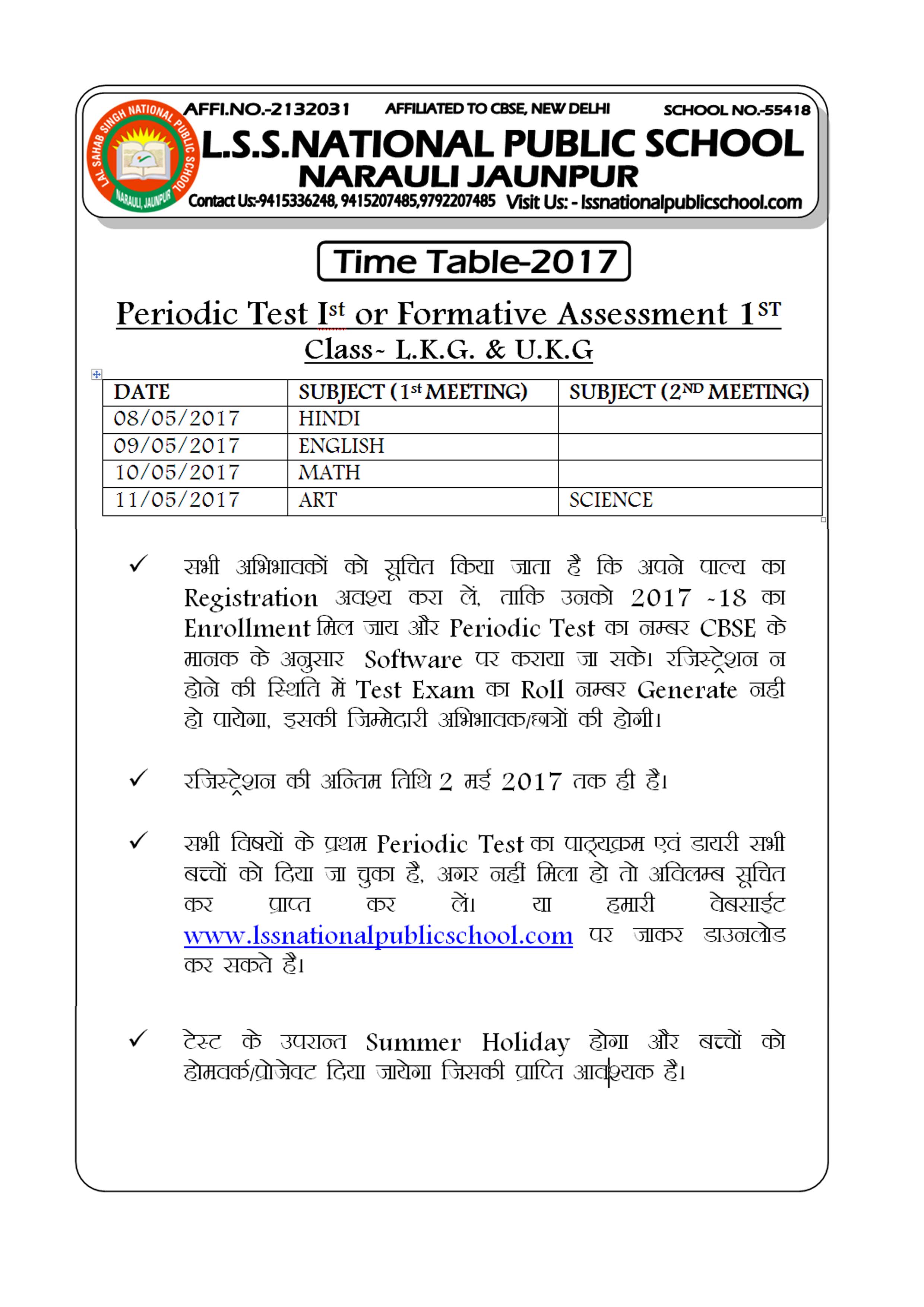 TIME TABLE OF PERIODIC TEST 1ST LKG UKG
